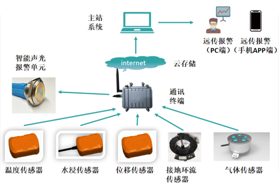 電纜井綜合環(huán)境監(jiān)測(cè)系統(tǒng)主要通過(guò)通過(guò)2.4G無(wú)線自組網(wǎng)通信集成傳感器采集實(shí)時(shí)數(shù)據(jù),利用NB-ioT物聯(lián)網(wǎng)通信以15-240分鐘一次(可設(shè)置)的頻率向云端發(fā)送數(shù)據(jù),后臺(tái)主站再對(duì)云端數(shù)據(jù)進(jìn)行整理挖掘并解析及顯示,在有報(bào)警觸發(fā)的情況下主站以語(yǔ)音、短信、聲光報(bào)警方式進(jìn)行實(shí)時(shí)報(bào)警。