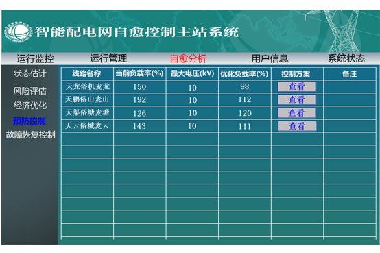 智能配電網(wǎng)自愈控制主站軟件通過(guò)智能終端設(shè)備或現(xiàn)有配電自動(dòng)化系統(tǒng)對(duì)配電設(shè)備和分布式電源運(yùn)行狀態(tài)的實(shí)時(shí)采集、與現(xiàn)有調(diào)度自動(dòng)化系統(tǒng)的信息交互實(shí)現(xiàn)整個(gè)智能配電網(wǎng)的可感知,對(duì)配電網(wǎng)異常運(yùn)行情況如線路負(fù)荷越限、母線電壓越限、變電站出口開關(guān)跳閘或保護(hù)動(dòng)作給以判斷和報(bào)警,即實(shí)現(xiàn)智能配電網(wǎng)“自我感知”